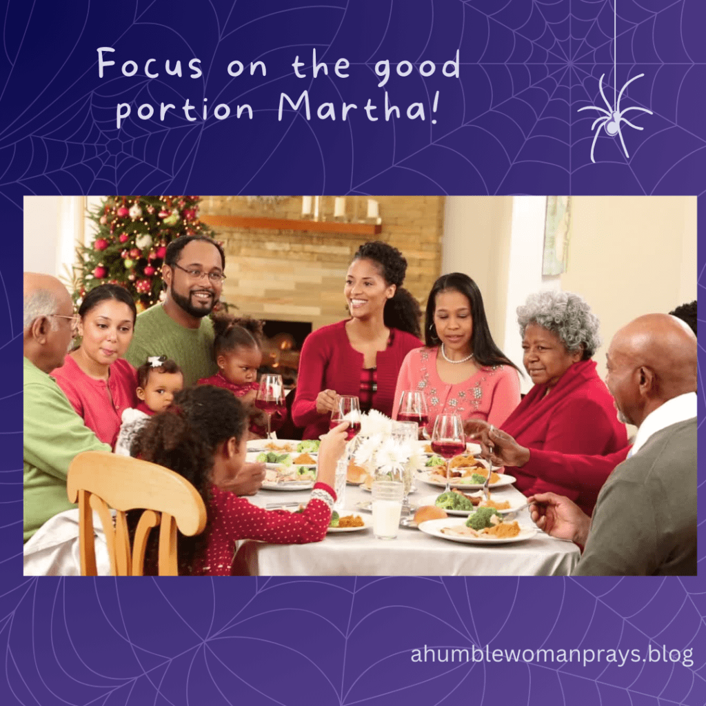 Our loving and understanding Lord, Thank you for the reminder that we don’t like being the resentful, negative, Martha. We want to be cheerful, nurturing and loving aka showing our Christ like self to all. Please help me to focus, give my time to the loving, peaceful and compassionate blessings of this life that you gave me. Thank you from the bottom of our hearts. Amen.